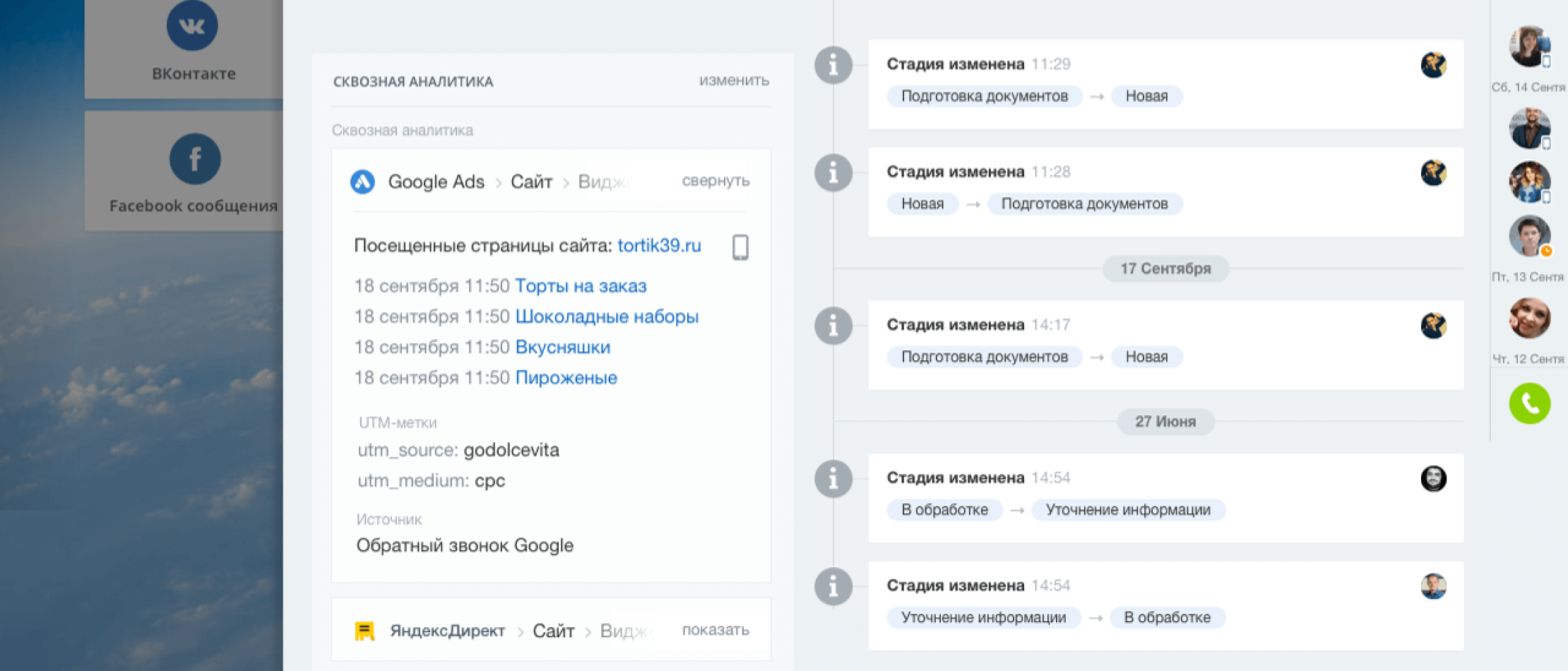 Детально изучайте, как маркетинг повлиял на каждую сделку: какую рекламу клиент увидел впервые, с какими источниками трафика взаимодействовал, какие страницы сайта посетил, через какой канал отправил заявку.