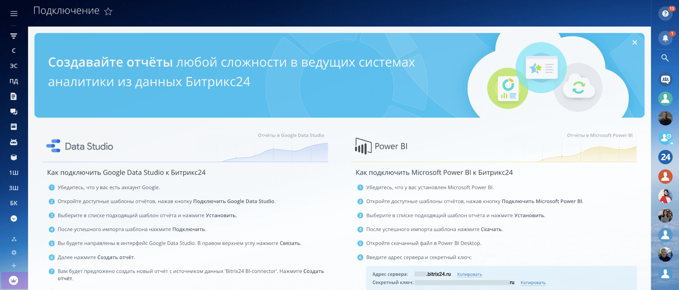 Передавайте данные из Битрикс24 в сторонние системы аналитики, такие как Google DataStudio или Microsoft PowerBI. Создавайте гибкие отчёты со своим набором показателей и интерактивной визуализацией, настройте регулярное обновление и автоматическую выгрузку отчётов.